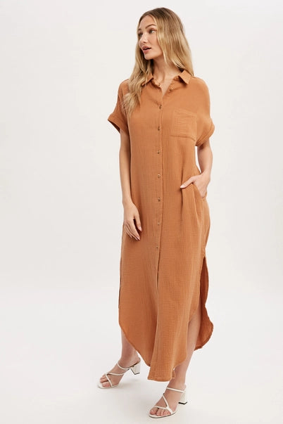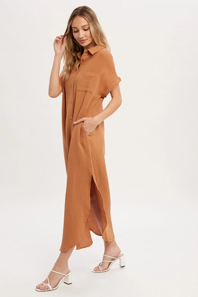 Woven maxi dress featuring a textured cotton fabric, v-neckline with a collar, short sleeves with cuffs, button up front, side seam pockets, side slits, front breast pockets and a relaxed fit.