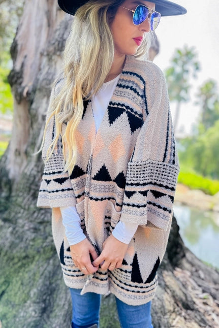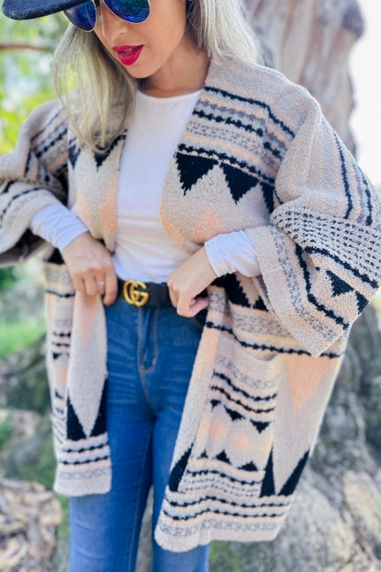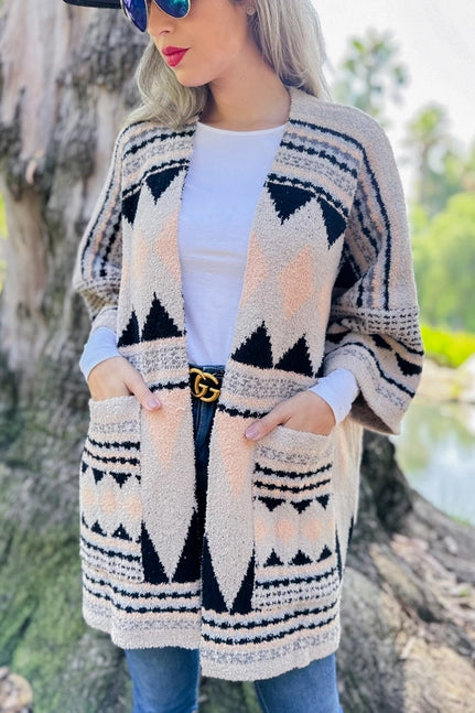 Aztec Printed Soft Knit Open Front Cozy Warm Jacket Cardigan With Pocket (Up to 1XL in one size)
